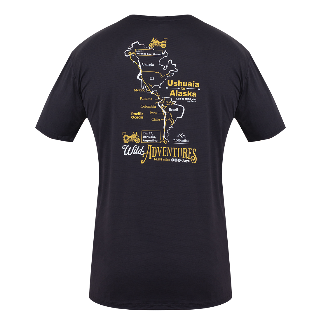 Camiseta em poliamida com elastano, tecido respirável em Dry muito leve e confortável. Possui gola redonda, estampa exclusiva Let´s Ride On utilizando o próposito WILD ADVENTURES e demonstrando a rota mais desejado do continente americano Ushuaia-Alaska. Ótima para ser usada em sua expedição pelo seu conforto!